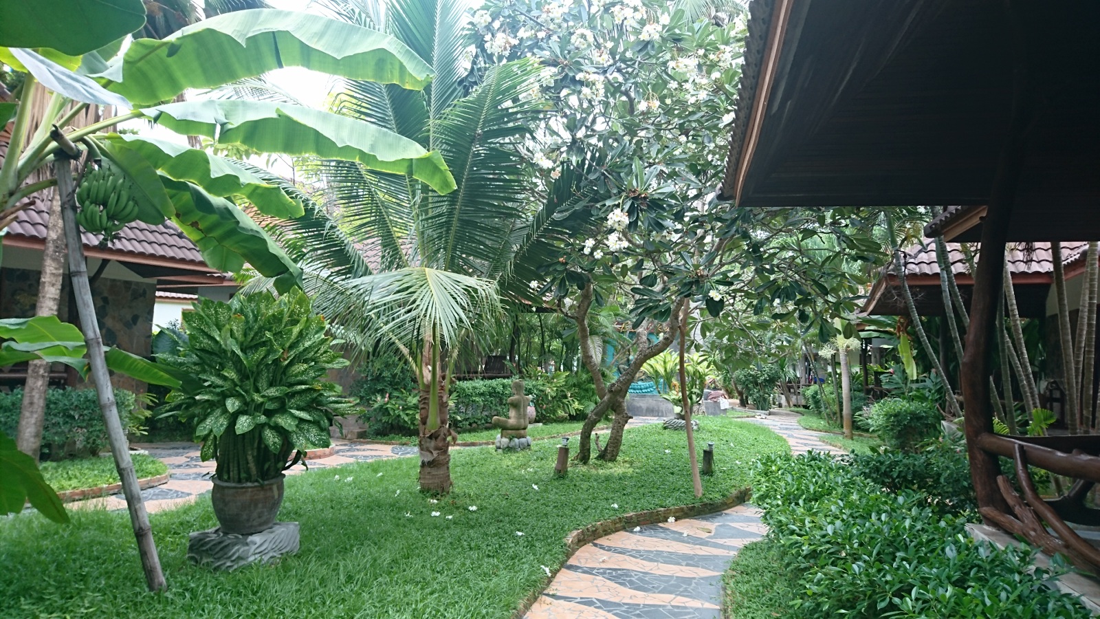 Das Salad Beach Resort hat uns mit einem wunderschönen Garten verführt. Duftende Frangipanibäume (Leelawadee auf Thai) und hübsche Statuen und Sitzgelegenheiten, ein sauberer Pool und Liegen am Strand.